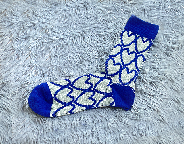 大きなハート柄がインパクトのあるカラーソックス。程よい厚みで一年中履いていただけます。