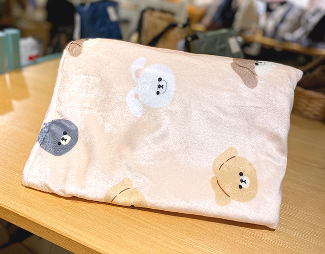 ブルーブルエらしい可愛いキャラクターのブランケット。お子様とのお出掛けや、オフィス、学校でも便利なアイテムです。