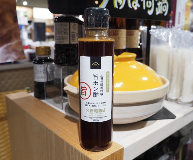 お酢のかわりに高知産のゆず、徳島産のすだちと幻の柑橘と言われるゆこうの3種類の果汁を使った久世福オリジナル、三種の国産柑橘 旨ポン酢(518円)。水炊きや寄せ鍋などシンプルなお鍋をする際に、つけだれとして使うと一気にお店の味に変わります。