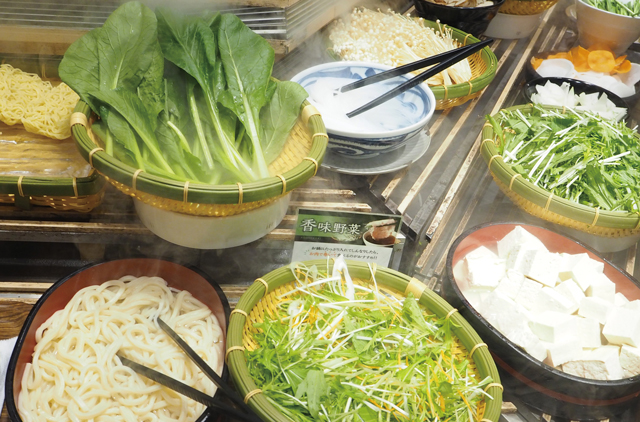 さっそく野菜バーにお鍋の具材を取りに行きます。お鍋にぴったりの葉野菜、食べ応えのある根菜、風味抜群のきのこ、お豆腐やうどんなどもずらり!