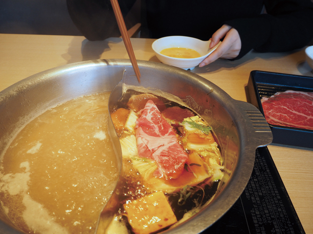 鍋は、昆布やすき焼きなど数種類のだしから2種類を組み合わせて楽しめるスタイル。今回は「生姜みぞれだし」と「すき焼きだし」を選びました。ほかに「旨辛だし」や「鶏白湯だし」などもあり、いろんな組み合わせを試したくなります。