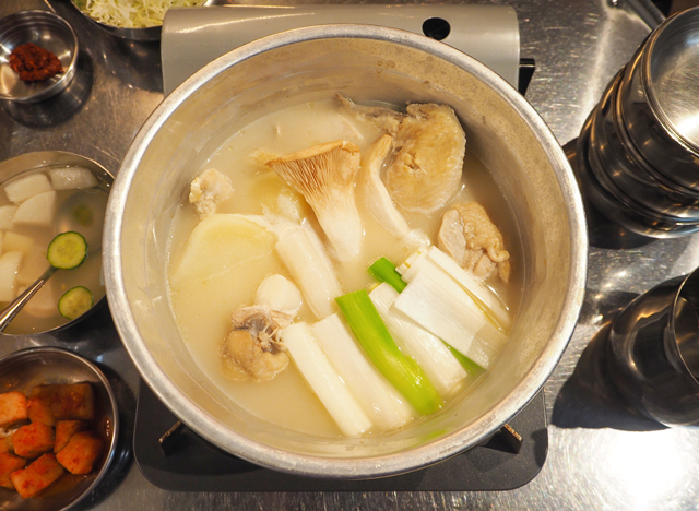 「タッカンマリ」も韓国鍋料理の定番ですよね!鶏が大胆に入った水炊きで、あっさりとしていながらも深いうまみに酔いしれます。やさしい味わいのスープには大きめの具材がゴロゴロ入って、食べごたえも抜群。「コッキオ」では、お鍋のほか水キムチやカクテキもセットになっています♪