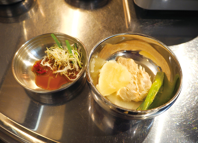 最初は何もつけずに、スープとともに具材をいただきましょう。鶏のだしがしっかり感じられ、芯からあたたまる美味しさです。すっごく軟らかな鶏肉や、ほろっと崩れるじゃがいもも美味!