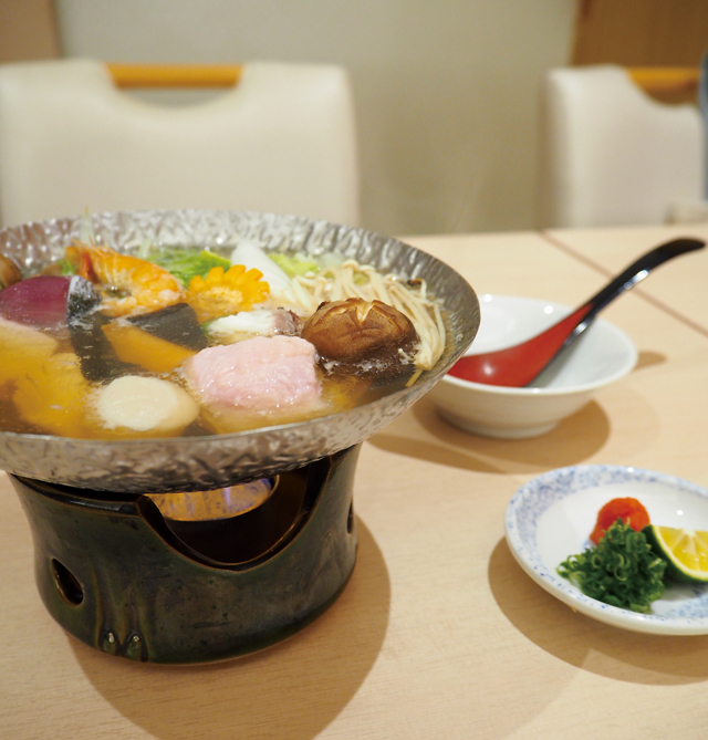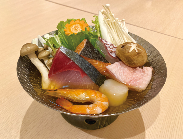 こちらはひとりで食べ切れるサイズの「海鮮寄せ鍋」。エビをはじめとした新鮮な魚介がふんだんに盛り込まれた逸品で、特製のだしとともに煮込んでいただきます。