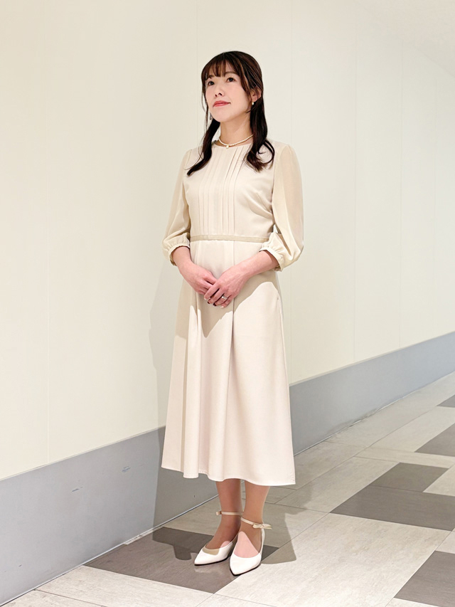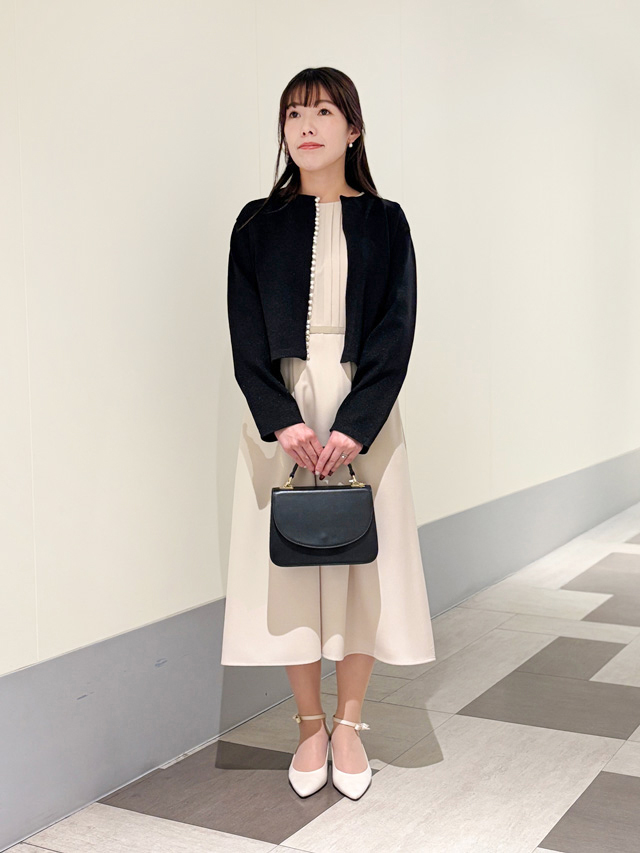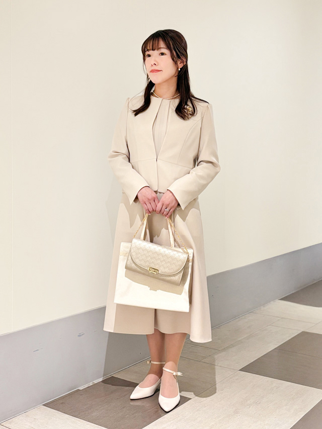 ワンピースとおそろいのジャケットを合わせた、クラシカルできちんと見えするコーデ。ベージュなら、やわらかく暖かみのある印象で大切なハレの日にぴったりです。