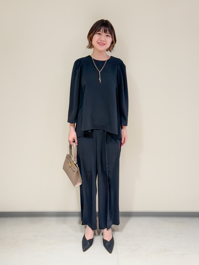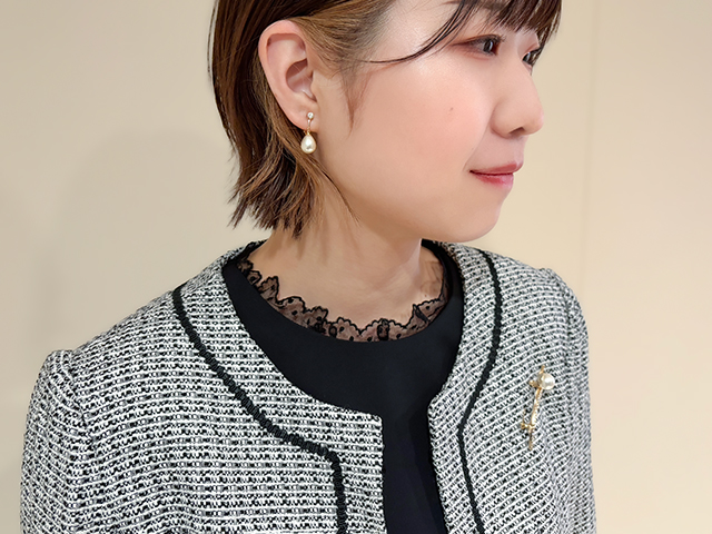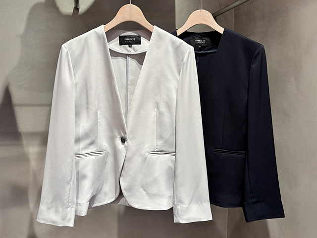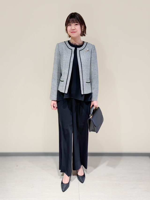 「シンプルで上品なデザインが多いので、インナーや小物で華やかさを加えるのがおすすめです。コサージュを飾ったり、リボンタイプのカットソーを選んだりと、少し意識するだけでオケージョンシーンでも映えるスタイルが楽しめます。」(スタッフさん)