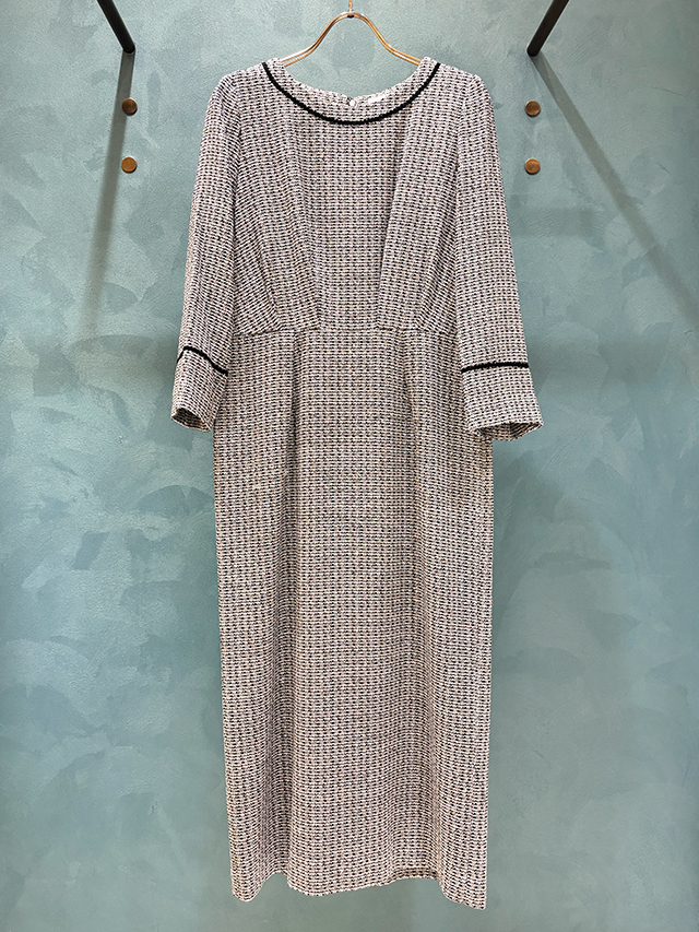 クラシカルな印象のツイードワンピース。上半身のタックやスカートのタイトラインなど、さらっと着てもメリハリのあるスタイルへ導きます。