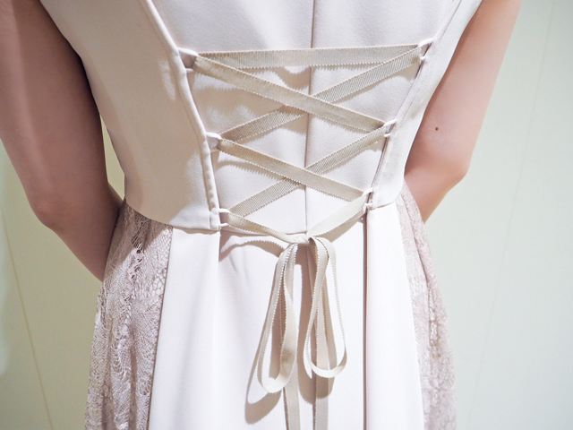 背中のレースアップでサイズが気軽に調整できるので、美しいシルエットに整えつつ、体型を気にせず長く着られるのもうれしいポイントです。