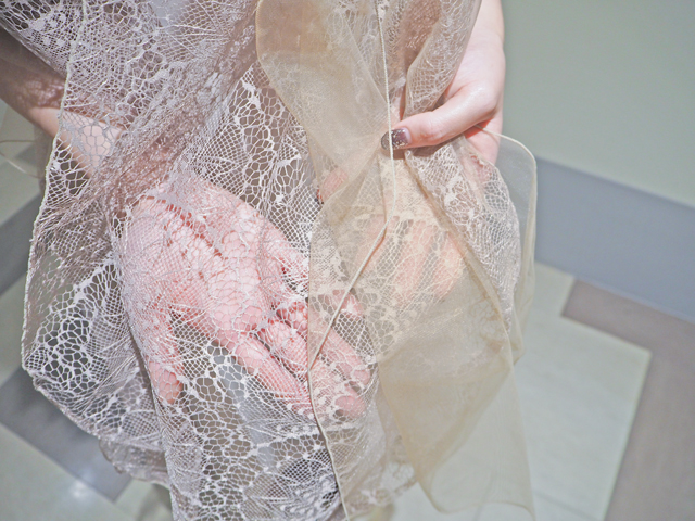 レースとチュールは2枚重ねになったデザインなので、さっと羽織るだけでほどよいボリュームもプラス。リバーシブルタイプなので印象も変えられます。