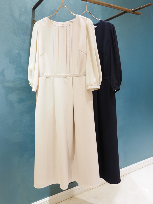 パフスリーブ×胸元タックデザインフィット&フレアワンピース 各28,600円