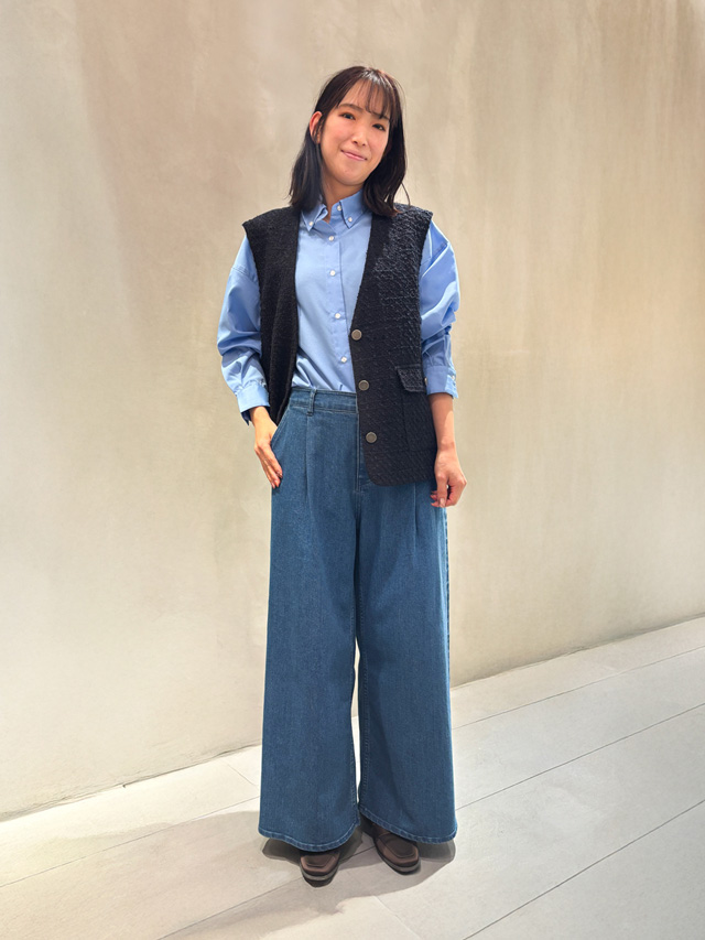 コーデが映えるブルーのシャツをインナーに、ワイドシルエットのデニムでカジュアルに。オーバーサイズシャツはウエストインして、ジレとのバランスを調整して。