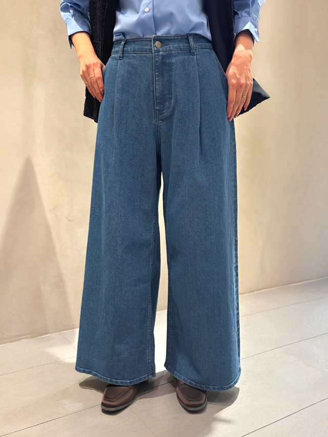 タック入りデニムなのできれいめ感は損なわず、ツイードジレにもすんなり馴染みます。足元はローファーでまとめて、シックな佇まいに。