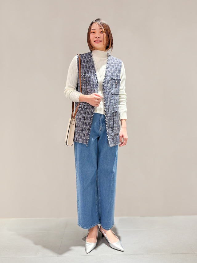 ツイードとデニムの相性の良さを生かした上品カジュアルコーデ。脚のラインを拾いにくいテーパードシルエットのデニムと丈長ジレで、自然に体型カバーもできます。
