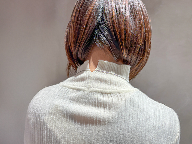 バックにスリットが入ったニットは、首元の締め付け感がなく楽に着られます。ぴったりしすぎていないランダムリブで、さらっと着やすい1枚です。