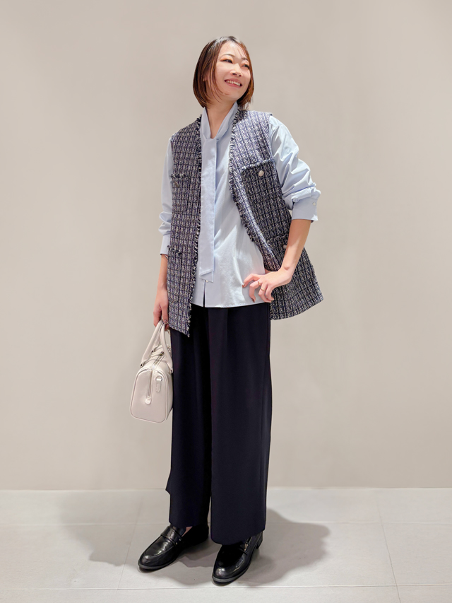 ボウタイシャツとワイドパンツでハンサムな雰囲気に仕上げつつ、ツイードジレで華やかさをプラス。足元はヒールシューズが苦手な方にも安心のローファーで、楽ちん&きちんと見え。