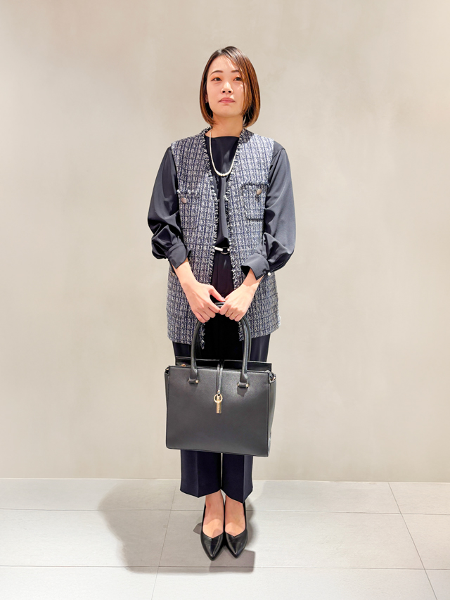 「せっかくのハレの日なので華やかなコーデを楽しみたいところですが、主張が強すぎるのはNG。上品で清潔感のあるアイテムがおすすめです。入園式には明るいベージュ系、卒園式にはダークカラーを選ぶと良いと言われていますが、着回しを考えてネイビーをベースに、インナーのブラウスでカラー調整をするのもGOODです。不安なこと、気になることがございましたら、スタッフになんでもご相談くださいね。」(スタッフさん)
