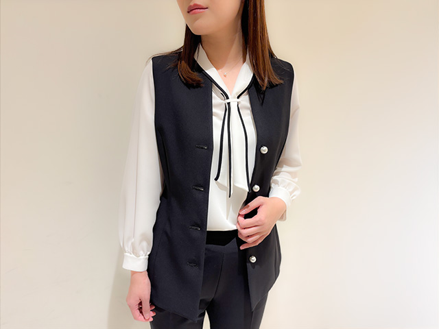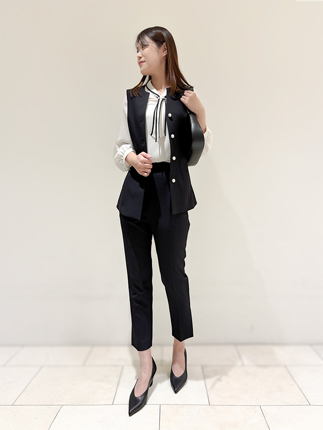 バイカラーのボウタイブラウスを合わせ、キリッと引き締まったオフィススタイルへ。ジレのボタンは開けて縦のラインを意識すれば、さらに洗練された雰囲気に。