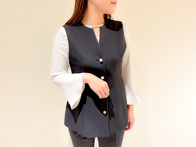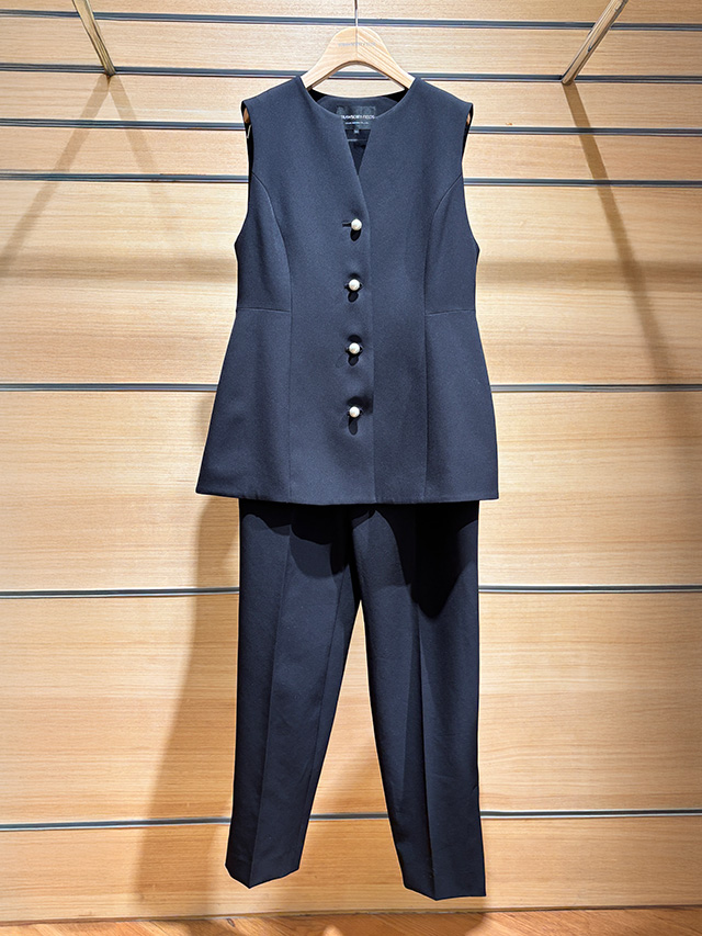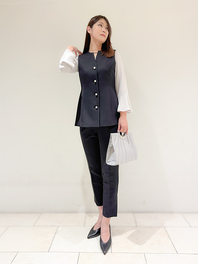 上質感のある生地のセットアップ。パールボタンのジレとラインが綺麗なパンツをセットアップで着用すれば、スタイリッシュなセレモニースタイルに。シンプルデザインなので普段にも着回しやすいです。