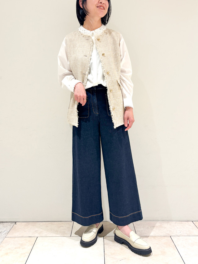 きれいめジレと相性の良いワイドシルエットのデニムパンツと、ローファーシューズでカジュアルダウン。襟元にレースを施した華やかブラウスなら、ジレともスムーズに馴染みます。