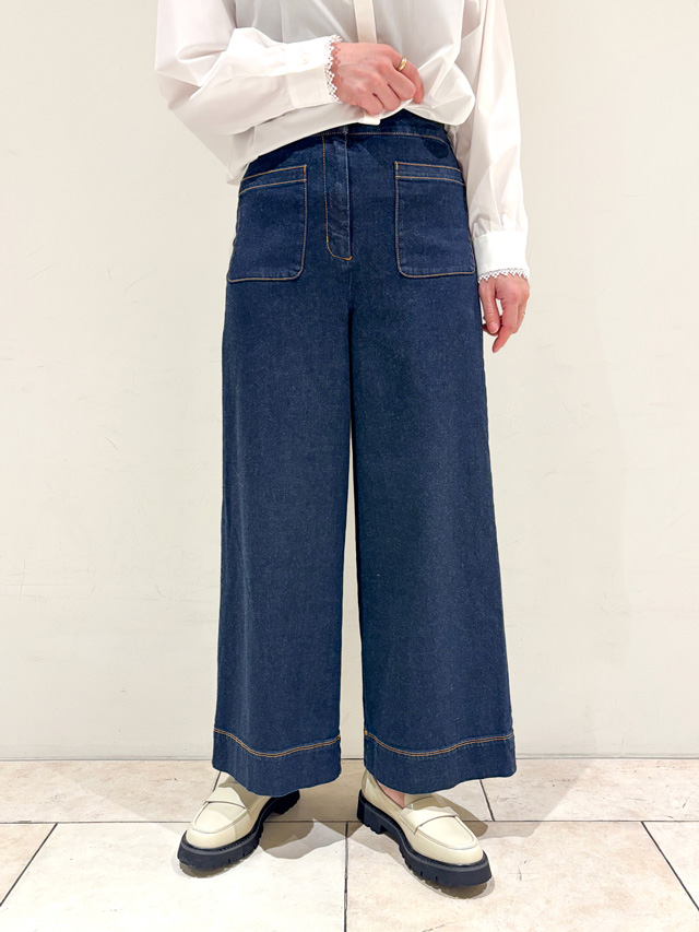 腰回りすっきりのデニムは、カジュアルすぎずに上品に着られます。ポケットや裾周りのステッチが利いて着映えも確実。