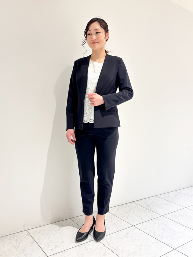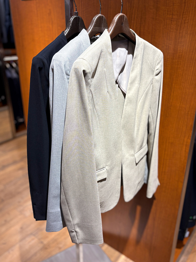 着回したノーカラージャケットのほか、共生地でテーラードジャケット、キーカラージャケットもあります。それぞれワイドパンツやテーパードパンツと合わせられるので、ぜひショップで着回してみながら自分らしいセットを探してみて。