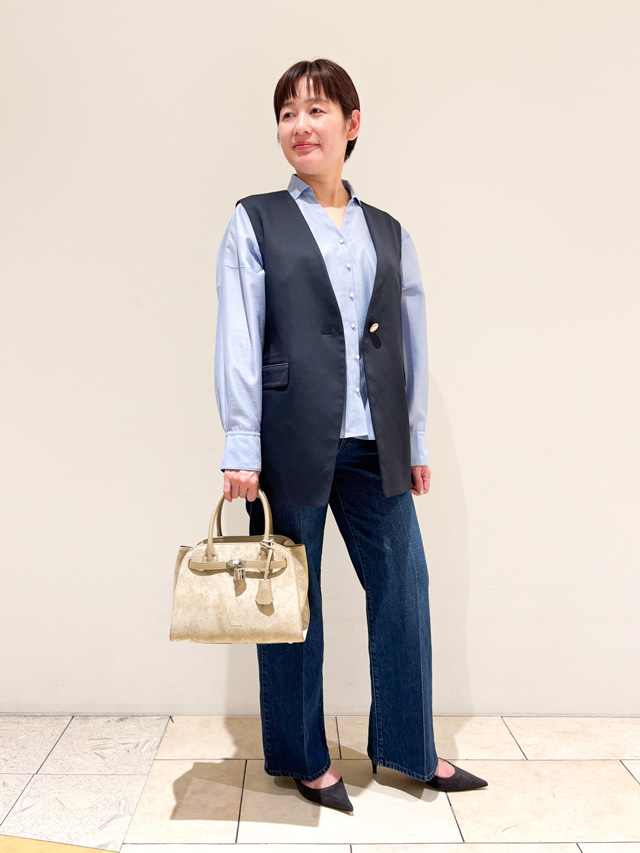 綺麗なブルーのブラウスとデニムを合わせた、ワントーンの大人カジュアルコーデ。デニムはジレの上品な素材感とも馴染みやすいよう、センタープレスのきれいめデザインを選んで。