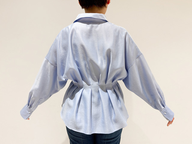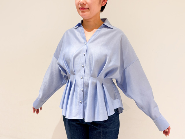 ウエスト部分にタックの入ったブラウスは、シルエットがとっても美しく1枚でも存在感あり。パール釦で華やかさもあり、気合を入れたい日のおでかけにもちょうどいいです。