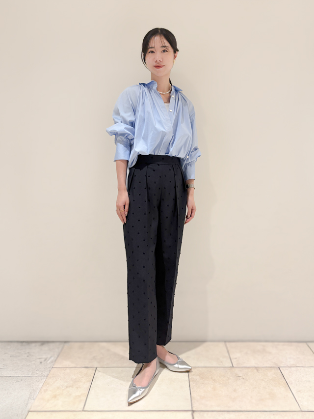 ブラウス胸元のパールパーツは、ネックレス見えするのでアクセサリーいらず。甘すぎないフレアスリーブも大人っぽく、さりげなくおしゃれを演出します。