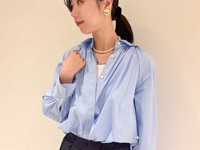 前身頃にギャザーがたっぷり入った遊び心のあるシャツを合わせ、春のおでかけも心地よく♪フロントのボタンの留め位置を変えればカシュクール風にも。