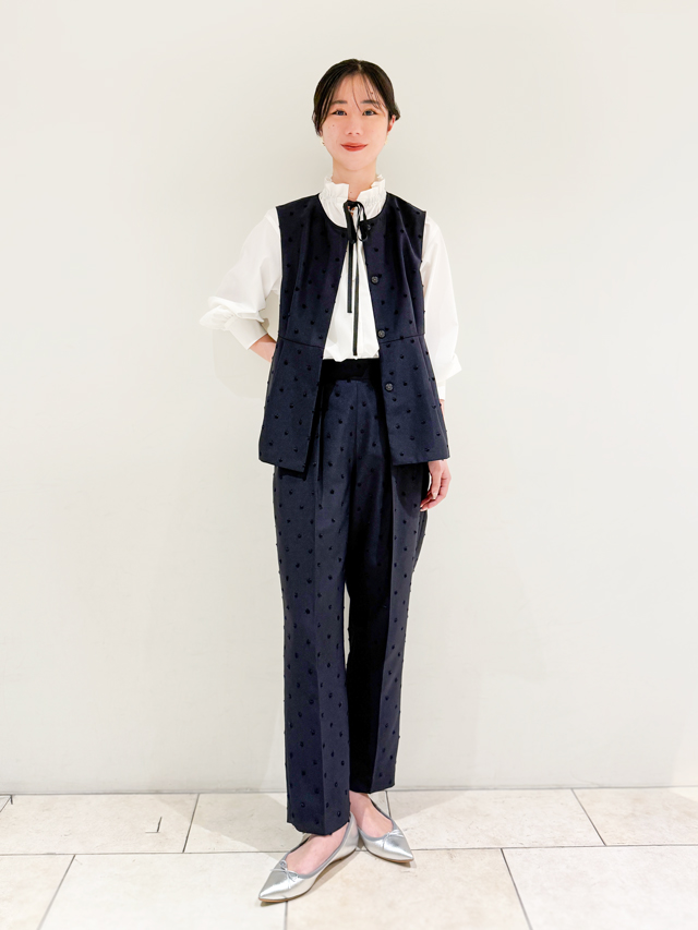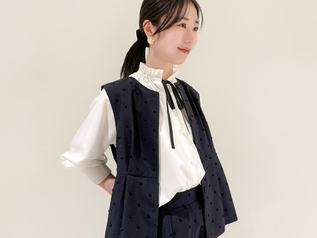 パンツと同素材のペプラムジレを合わせたセットアップコーデ。ドットが同色なので派手すぎずにほどよく華やかさを演出できます。フリルの衿が印象的なブラウスは、リボンを結んでマニッシュな雰囲気もプラス。