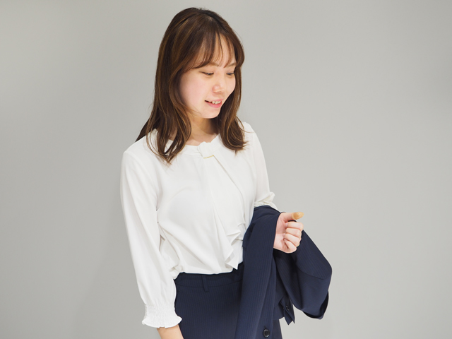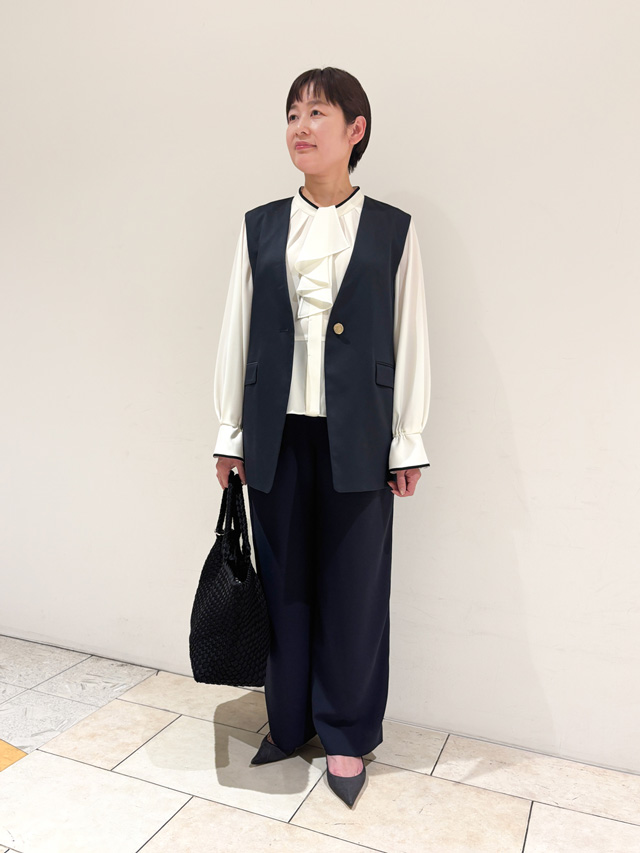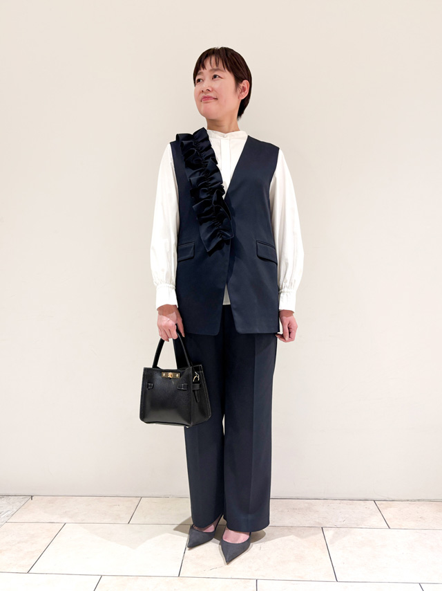 インをホワイトにすると、ぐっと締まって見えて好印象。スタンドカラーのブラウスなら、襟元のフリルとの相性も◎です。