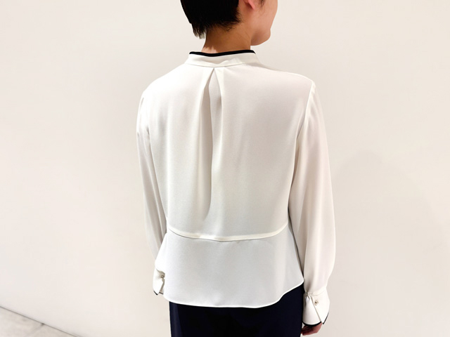 襟元や背中のタック、ウエスト切り替えのペプラムデザイン、袖口のやわらかなフレアなど、ディテールにとことんこだわったブラウス。ストレッチ素材で着心地が良く、シワになりにくいのもオフィス向き。