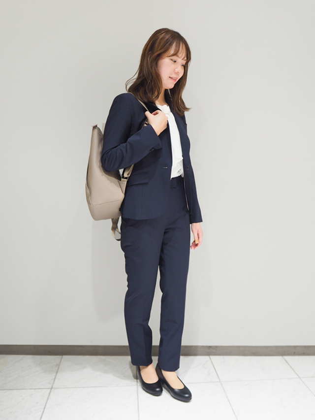 インはカットソーにして大人なイメージに。ビジネスシーンには、やっぱりシンプルなカットソーが使いやすくて重宝しますね♪スーツに映えるバックパックなら、キレイめな印象を崩さずに動きやすさ満点。