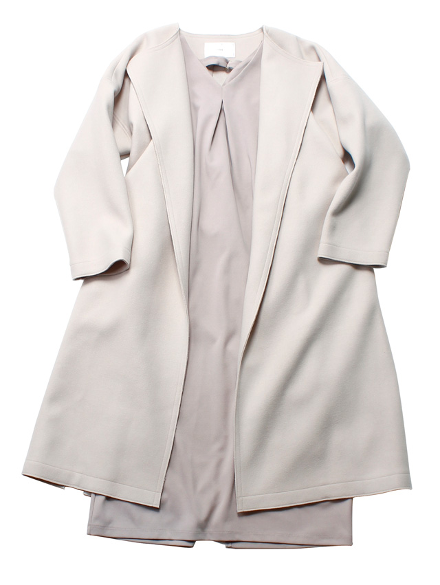 カットメルトンを一重で仕立てたラップロングコート。カジュアル感のある人気素材を上品なシルエットで仕立てました。軽い着心地ながら落ち感がありこなれた印象。余裕のあるサイズ感で、分厚いニットやインナーダウンも着込めます。寒い時は付属のサッシュで片結びしてアレンジするのがおすすめ。通勤から近所へのお出かけまで対応できる万能アウター。ワンピースはジャージ素材で楽ちんな着心地ながら、コートと同系色できれいにまとまります。
