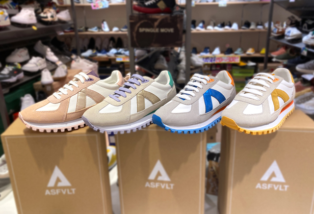 大阪府内では高槻とズックズッカでしか取り扱いがない、とってもレアなスニーカーブランド、アスファルト。遠くからこのブランド目当てに訪れる人もいるほど人気です。マラソンタイプの「ゲート」は、カラバリも豊富にラインナップ。ふわっと軽やかな色合いなので、カジュアルからフェミニンまで幅広く対応します。