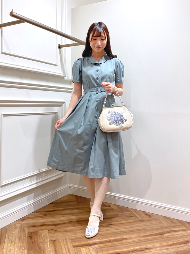 美しいシルエットなのでレイヤードせずともとっても魅力的。大人気のスミレ刺繍シリーズのバッグとサンダルを合わせて、ほどよい可愛らしさをプラス。