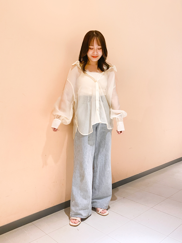 ガーリーなシャツをあえてデニムに合わせてカジュアルダウンさせ、よりヘルシーキュートな印象に。シアーなシャツも抜け感たっぷりでこなれた雰囲気が簡単に演出できます。