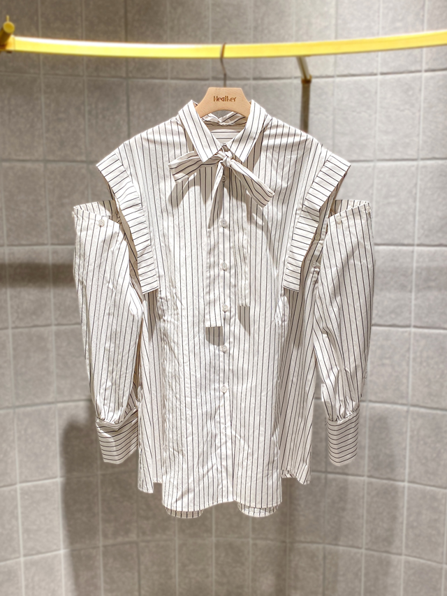 ショルダー部分がボタンで開閉できるビッグサイズシャツ。ボタンを開ければ夏にも映えるヘルシーなシャツスタイルになり、閉めれば羽織りなどにもぴったりです。リボンは取り外しできるので、ハンサムな着こなしにもしっかり対応。ショートパンツと合わせてワンピース風に着こなすのがヘザー流です。