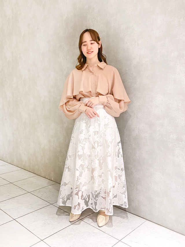 今季トレンドのケープをデザインに取り入れたブラウス合わせて。ボリュームブラウス×ハイウエストスカートで、視線が自然と上を向き脚長見えを叶えます。ヌードカラー×レースの女性らしい取り合わせもすてき。