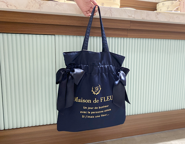 上品な光沢感のあるサテン地に、ゴールドのブランドロゴプリントが映えるトートバッグ。くしゅっとよせたギャザーと、両サイドの大きなリボンが大人可愛いアクセントに!