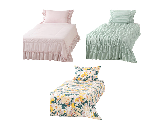 シリーズにはプリント4色、ギャザー2色もあり、掛け布団・枕カバー・ベッドパッドを展開しています。ベッドコーデにこだわりたい方にぴったり。