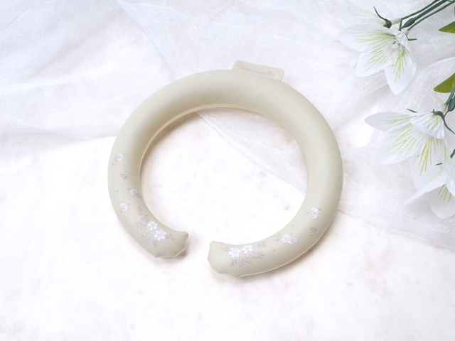 28℃以下で自然凍結して、ちょうどいいひんやり感が続くネックリング。氷と違って低温になりすぎず、肌に心地よい温度をキープ。冷凍庫なら約30分で凍結するほか、冷蔵庫や水道水でも冷やせます。運動やスポーツ、アウトドアなどに1本持っておくと便利なアイテム。ハンディファンと組み合わせれば、さらに涼しさがアップしますよ。繰り返し使えて環境にやさしいのも魅力。淡い色に可愛い花のイラストが入っていて、「アフタヌーンティー・リビング」らしい品のあるデザイン。