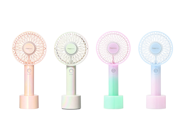 「フランフラン」からは、毎年大人気のフレ ハンディファンにグラデーションカラーが新登場!卓上でもハンディでも使えるパワフルな2WAYタイプで、風量は弱~強モードの5段階+リズム風機能付き。充電はUSBコードと付属の専用充電スタンドの2電源に対応しています。最大9時間の連続運転が可能。