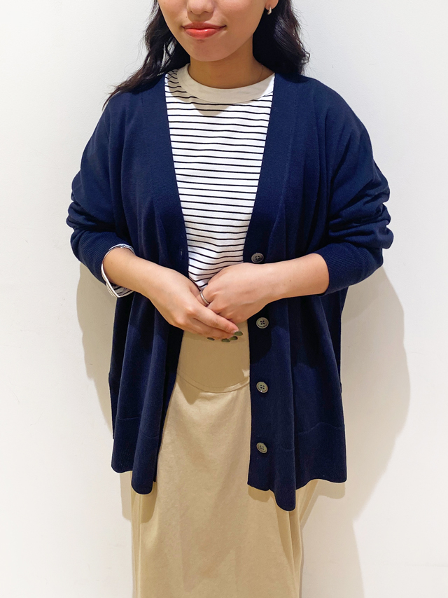 落ち感のあるカーデのシルエットを生かし、Iラインのロングスカートを合わせて縦のラインをアピール。ヒップまで隠れる丈感なので、気になる腰回りをカバーしてスタイルアップも叶います。中に長袖を着ても響きにくい、ゆったりシルエットもGOOD。