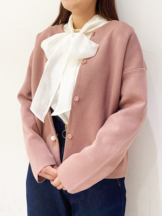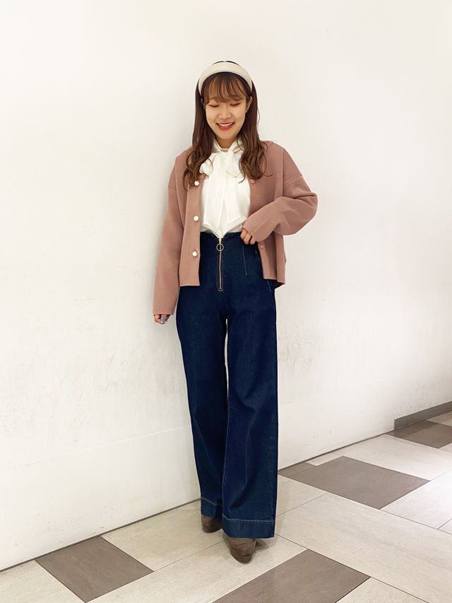リボンタイがついた、ふわりと揺れるフェミニンなブラウスに、ジップが特徴的なワイドデニムを合わせて、甘くなりすぎないフェミニンカジュアルに。くすみピンクのカーデがほどよく調和し、大人っぽい印象も楽しめます。