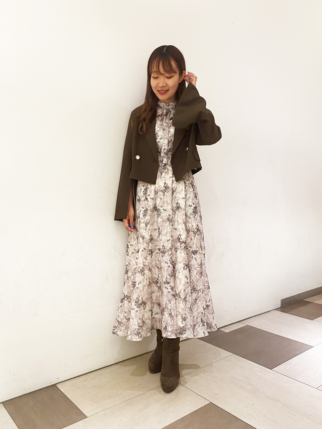 「カジュアル好きの方はもちろん、甘めテイストに仕上げたい方にもおすすめのジャケットです」とスタッフさん。フェミニンなワンピースにさらっと羽織れば、ほどよくこなれ感が出ておしゃれ上級者に。