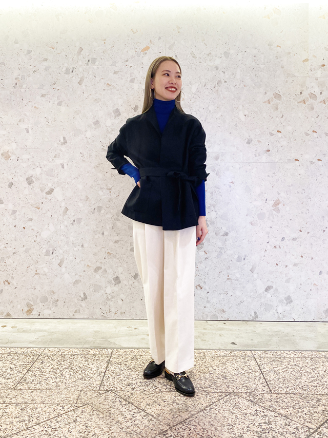 全体的にゆったりとしたデザインながら、付属のベルトでウエストマークすれば、きゅっと引き締まったきちんと感のある印象に。ワイドパンツを合わせてマニッシュに仕上げつつ、鮮やかなブルーのニットで華やかさをプラス。ジャケットを脱いでも洒落感たっぷりです。