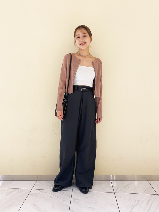 ベーシックなデザインなのでデニムでもスラックスでもいろんなボトムと合わせられますが、今回はあえて光沢感のあるスラックスをチョイスして、素材感の異なるほどよい高感度コーデに。秋色カーデを1枚羽織ることで、インナーとボトムスのシンプルな着こなしにクラス感が加わります。