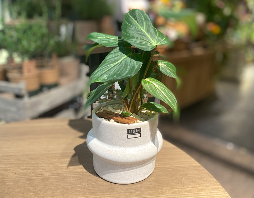 観葉植物の中でもフィロデンドロンは手入れの手間がかからず、初心者さんでもお世話がしやすい観葉植物です。また、ベルギー製のD&Mの個性的なポットは、お部屋に馴染むデザインでお部屋のワンポイントとしてもおすすめです。