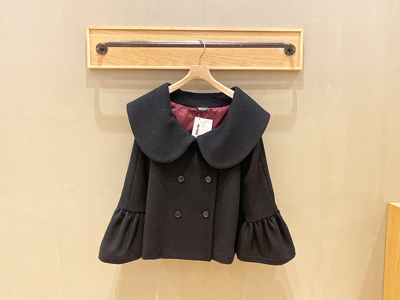 大きな丸い襟とフリルの袖がキュートなコート!着丈が短いのでパンツやスカートなど、どんなボトムスでもバランスが取りやすく合わせやすいアイテムです♪